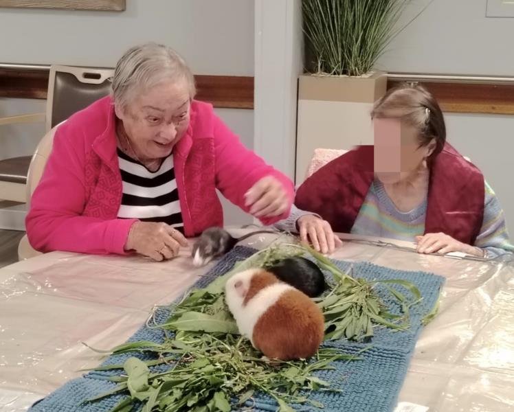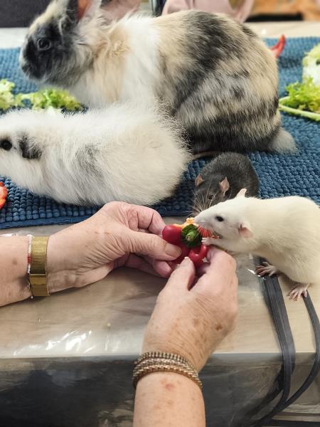 Chiens, cochons d’Inde, lapins… tous étaient au rendez-vous, chacun apportant sa douceur, sa curiosité ou son espièglerie. Les visages se sont illuminés, les mains se sont tendues, les souvenirs ont affleuré. Certains ont murmuré des mots doux à un lapin blotti contre eux, d’autres ont souri à la malice d’un petit rat explorateur et d'un chien en manque de gros câlinous ! Les échanges ont été riches, spontanés, et profondément humains.