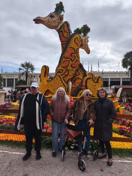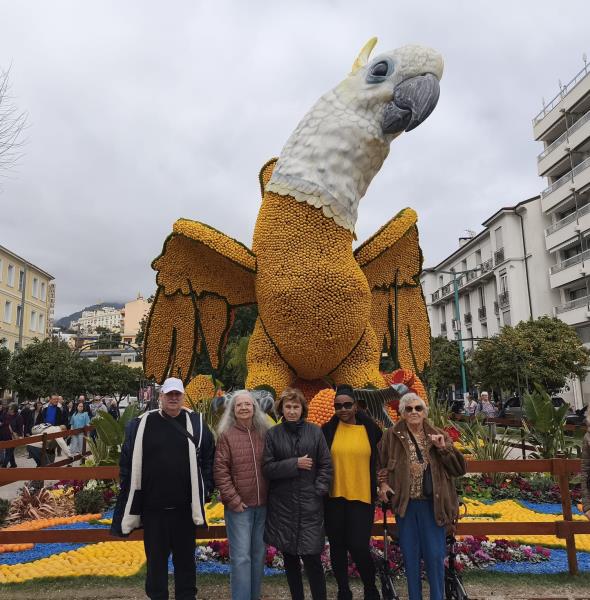 Les résidents ont passé une magnifique journée à Menton pour la célèbre Fête du Citron. Après un trajet en bus jusqu’à la gare, puis un agréable voyage en train de Cannes à Menton, chacun a pu profiter du paysage défilant, entre mer scintillante et collines verdoyantes. Arrivés à Menton, nous avons commencé par la visite du parc dédié à ses superbes sculptures d’agrumes, qui ont émerveillé tout le monde. Les couleurs vives, les formes originales et l’ambiance festive ont suscité émerveillement et sourires.